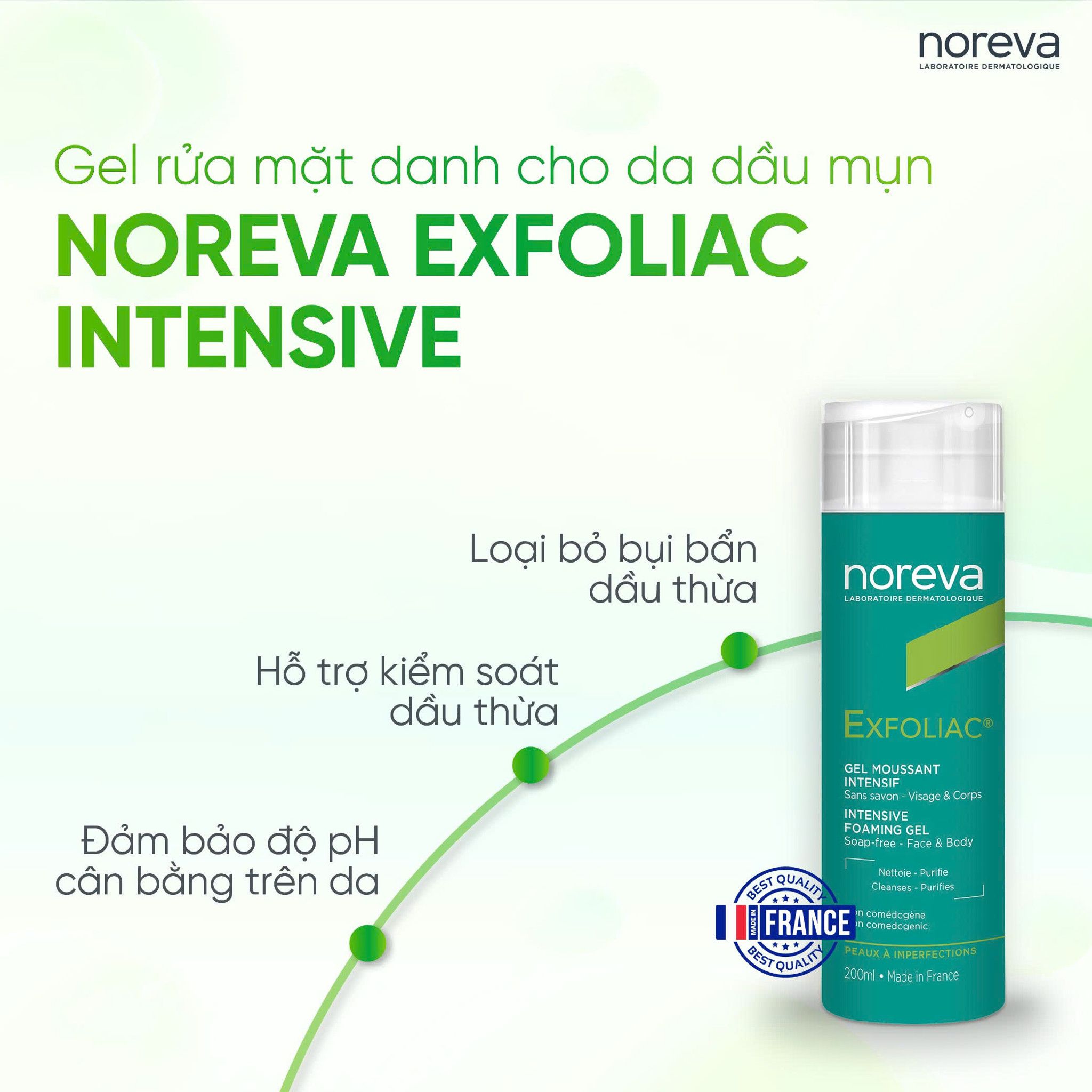 Mở màn cho "liên khúc" chăm sóc da là Exfoliac Intensive Gel rửa mặt. Với khả năng loại bỏ bã nhờn hiệu quả, sản phẩm này giúp kiểm soát dầu thừa, cân bằng độ pH trên da, mang lại cảm giác sạch thoáng mà không hề gây khô căng. Đây chính là bước đệm lý tưởng để làn da sẵn sàng hấp thu các dưỡng chất tiếp theo.