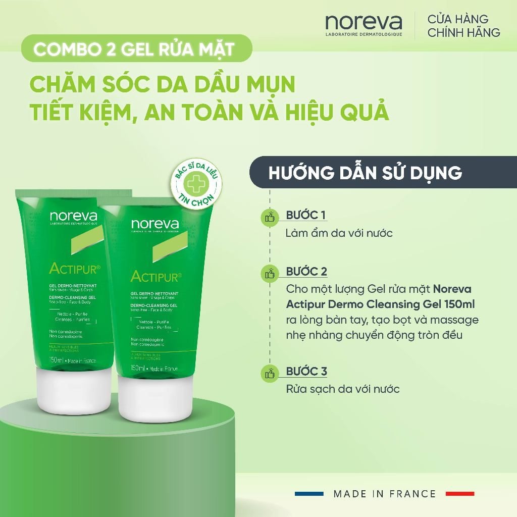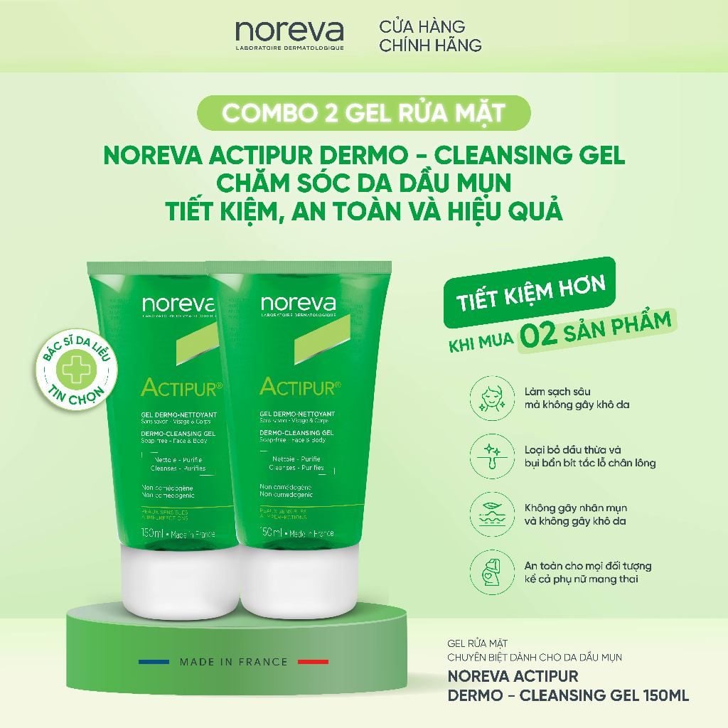 Combo 2 Gel rửa mặt Noreva Actipur Dermo Cleansing Gel 200ml – Làm sạch dịu nhẹ, hỗ trợ kiểm soát dầu