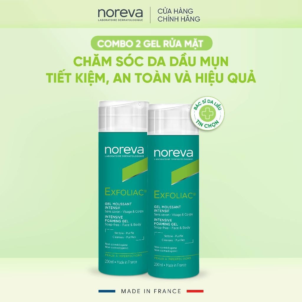 Combo 2 gel rửa mặt Noreva Exfoliac Intensive Foaming Gel 200ml chăm sóc da dầu mụn tiết kiệm, an toàn và hiệu quả